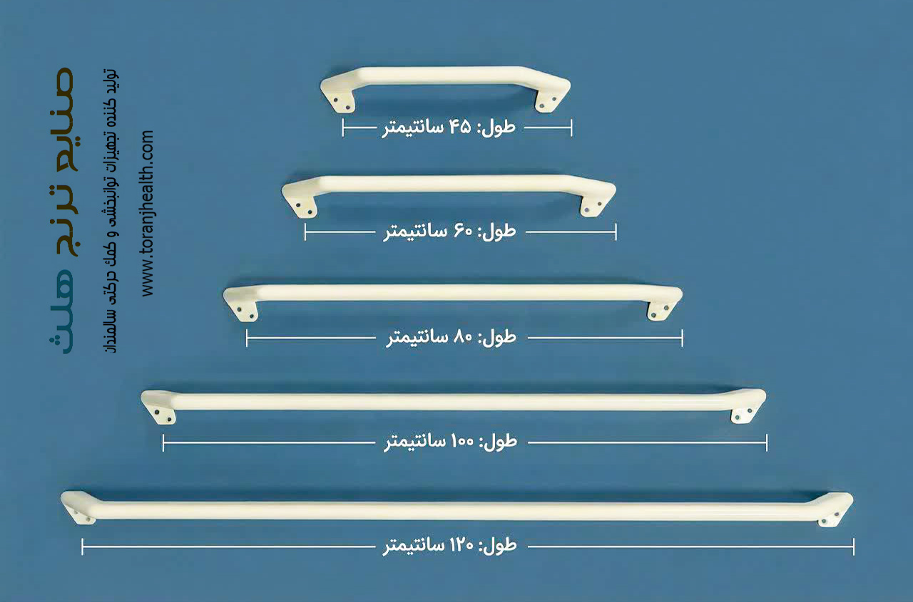 در تصویر زیر سایز بندی متنوع و طول های متفاوت انواع دستگیره دیواری توالت که توسط صنایع ترنج هلث تولید میشود را مشاهده می کنید. البته بنا به سفارش مشتریان عزیز، در ابعاد بلندتر یا کوتاهتر هم قابل تولید است.
